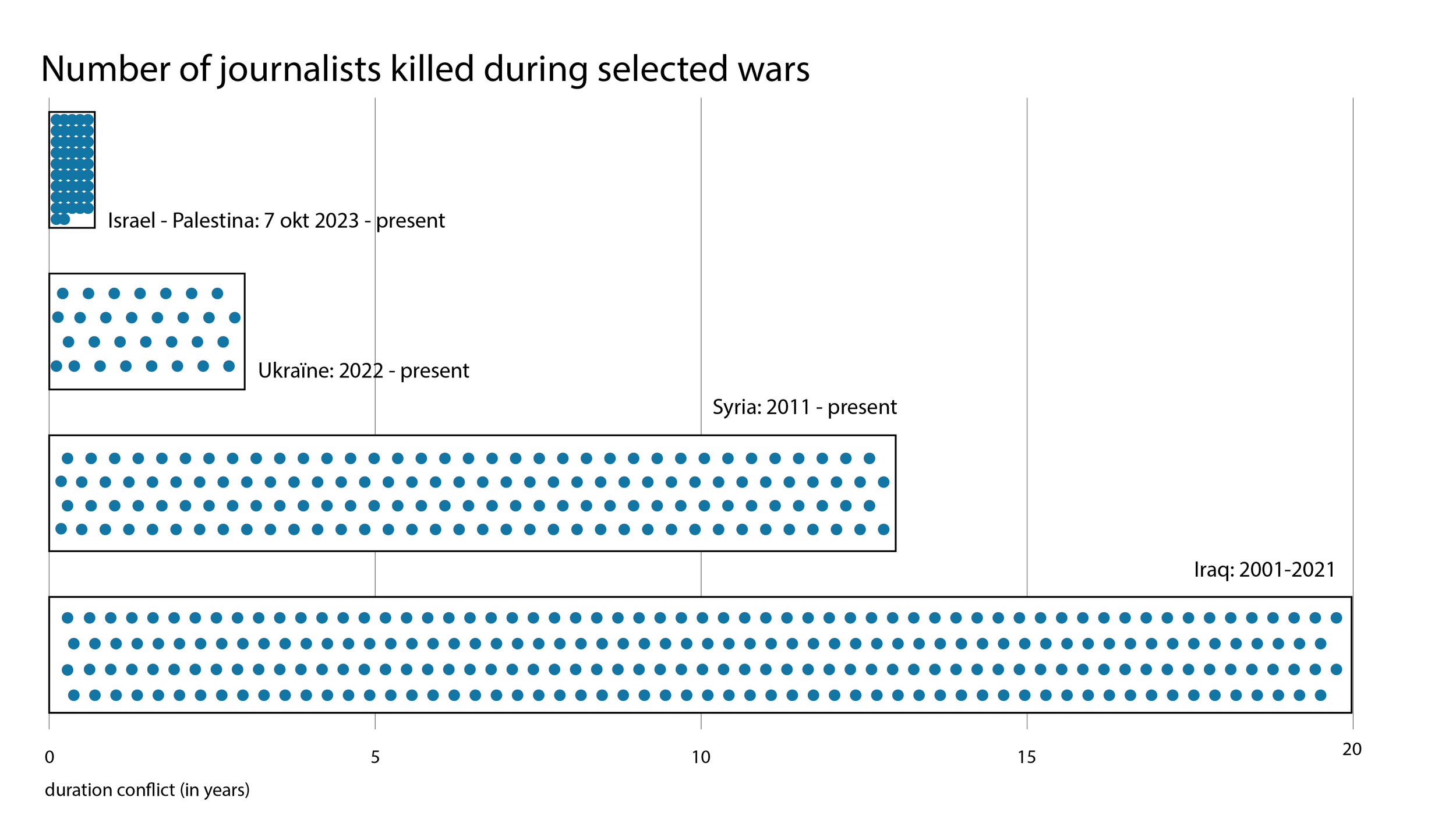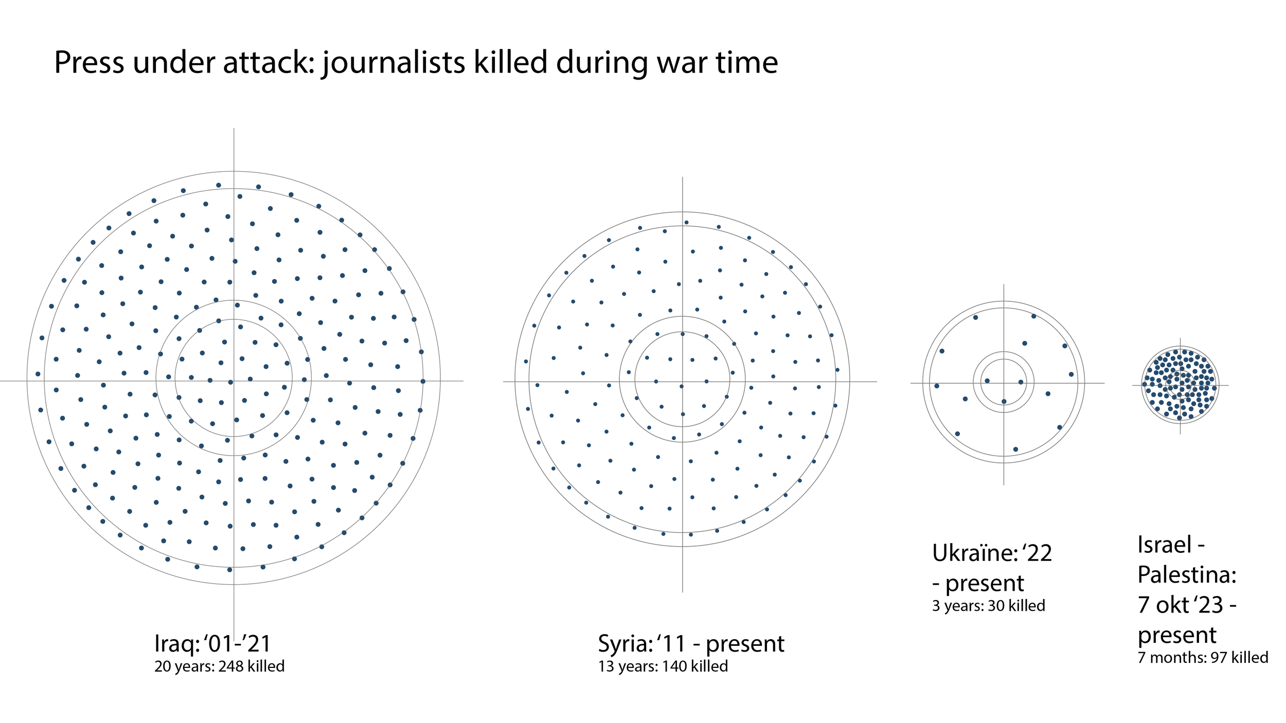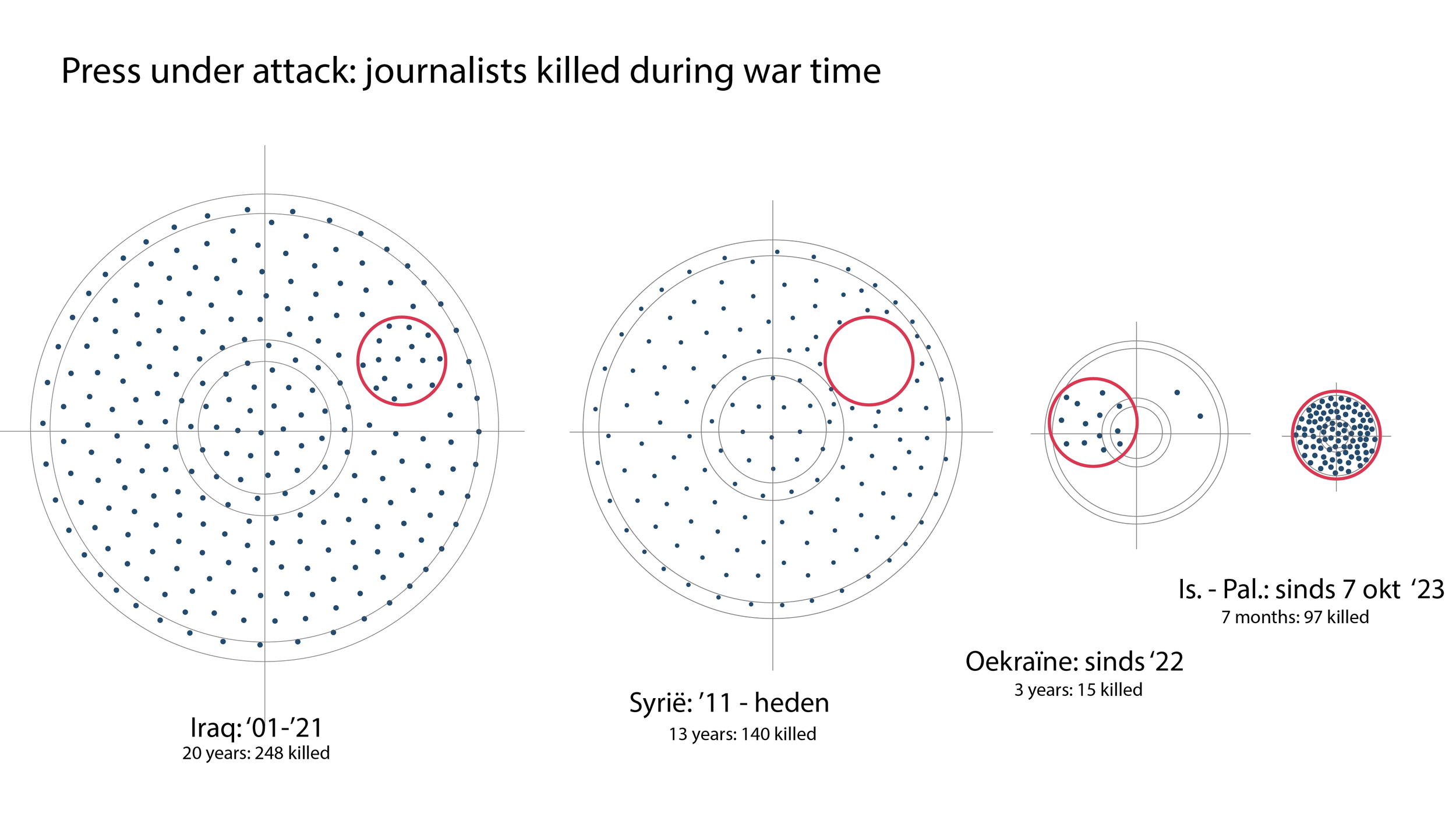 Never before have so many journalists been killed in a conflict zone as in Gaza. The CPJ database tracks press casualties worldwide from 1992 onward. I wanted to use it to show how the current situation compares to conflicts previously labeled deadliest: Syria and Iraq. I also decided to add Ukraine to this visualisation, because the war was still intensely reported on in the Netherlands.
